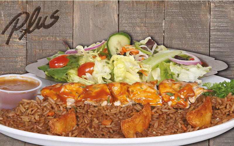 SERVIE AVEC RIZ BRUN, SAUCE B.B.Q. ET SALADE DU CHEF