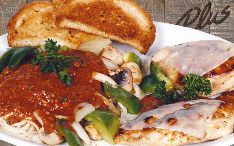 SERVI AVEC FROMAGE SUISSE ET SPAGHETTI SAUCE À LA VIANDE AVEC PIMENTS, OIGNONS ET CHAMPIGNONS
