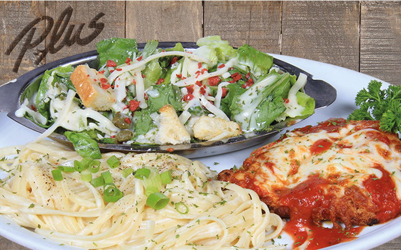 POULET GRATINÉ SERVI AVEC LINGUINI ALFREDO ET SALADE CÉSAR