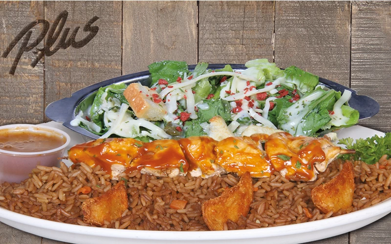 SERVIE AVEC RIZ BRUN, SAUCE B.B.Q. ET SALADE CÉSAR