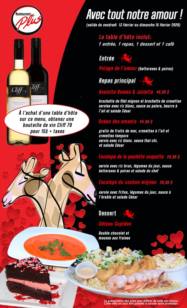 Une table d'hôte qui saura vous plaire pour la Saint-Valentin... Pour être certain de pouvoir profiter de notre promotion... Réservez tôt ! (819) 758-9927